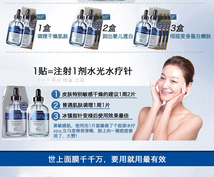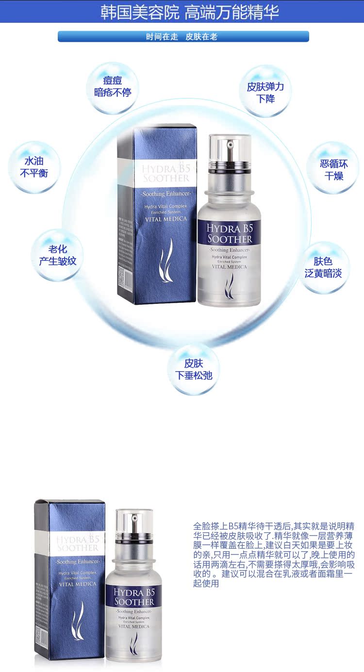 水乳精华三合一15ML:迅速渗透进表皮层,能吸收1000倍水份分子进入肌肤底层,增加其锁水能力,并补充营养要素,促进胶原蛋白合成,修护细胞并柔软粗糙肌肤,改善过敏,舒缓红痕现象,勇士预防因不同情况引起肌肤之干燥,并帮助减退眼部油脂肪寄眼纹等问题,使用后肌肤注满水分,倍觉水嫩清新
