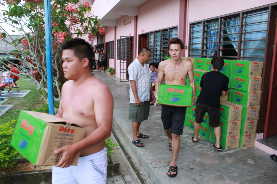 | 将早前由行动党赈灾队运抵的矿泉水取走分发给没列入为灾黎的村民 |