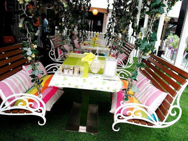 用着餐时被满满的花朵包围着,还可以选择在可爱的秋千上用餐!而且最惊喜的是,晚上和白天是完全不一样的呀~浪漫地蓝灯点缀着整间餐厅,真的是太浪漫了!♥