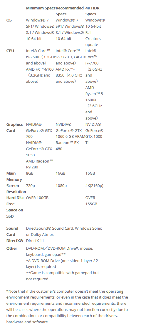 A benchmark tool and instructions to help players optimize their PCs for the game’s launch will be available beginning February 1. Please visit the official website for more information. Final Fantasy XV Windows Edition supports Native 4K and 8K resolutions with HDR10 and Dolby Atmos along with ongoing mod support. Check here the minimum, recommended and 4K PC specifications for players looking to enjoy the ultimate experience on PC.