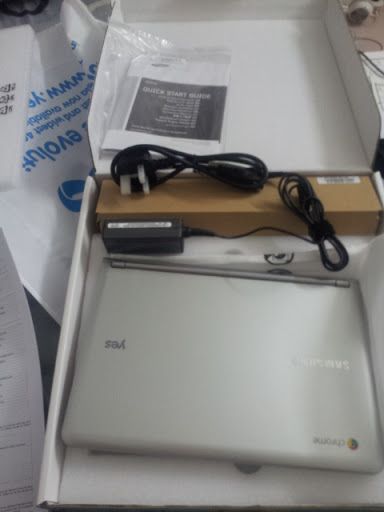 开起来之后,里面就只有chromebook一个,power adapter一个,以及使用说明书~ 在使用说明书里面还有一张google chrome的logo sticker~ 不懂是不是要我们模仿苹果用的呢?