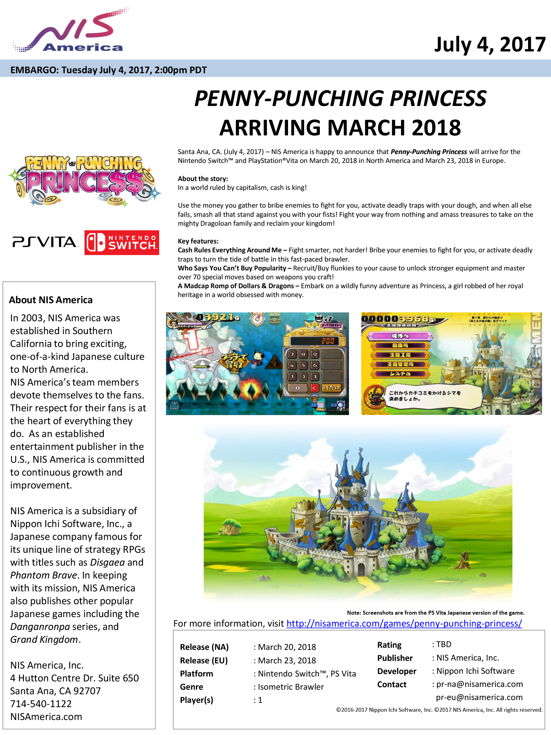 Penny Punching Princess, known in Japan as The Princess is Money-Hungry, is coming to PS Vita and Switch in North America on March 20, 2018 and in Europe on March 23, NIS America announced at Anime Expo 2017.