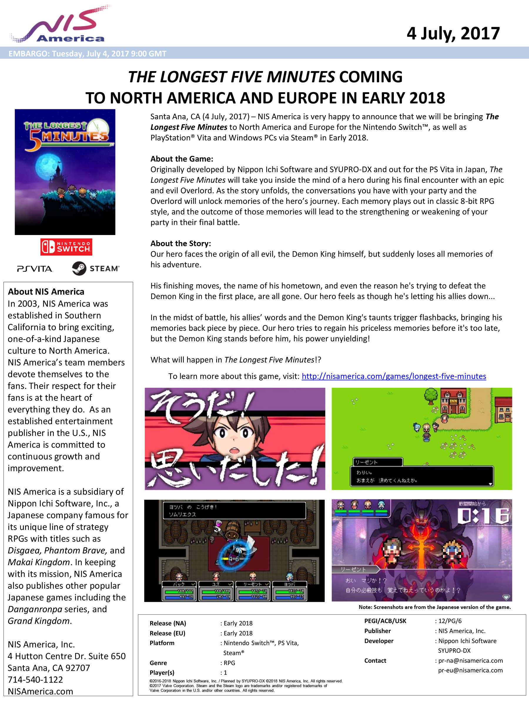 The Longest 5 Minutes will launch for Switch in addition to PS Vita and PC via Steam in early 2018, NIS America announced at Anime Expo 2017.