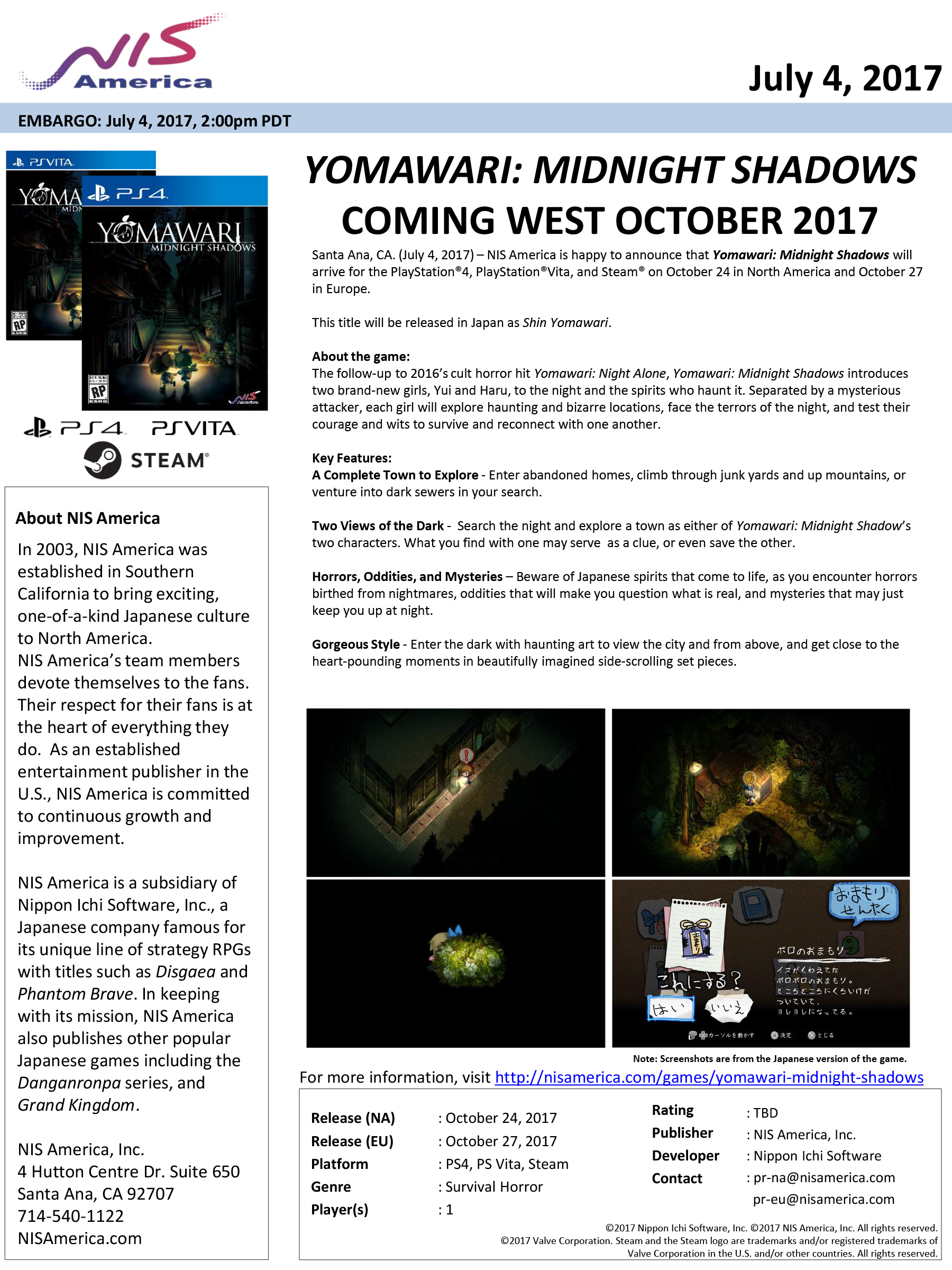 Yomawari: Midnight Shadows will launch for PlayStation 4, PS Vita, and PC via Steam in North America on October 24 and Europe on October 27, NIS America announced.