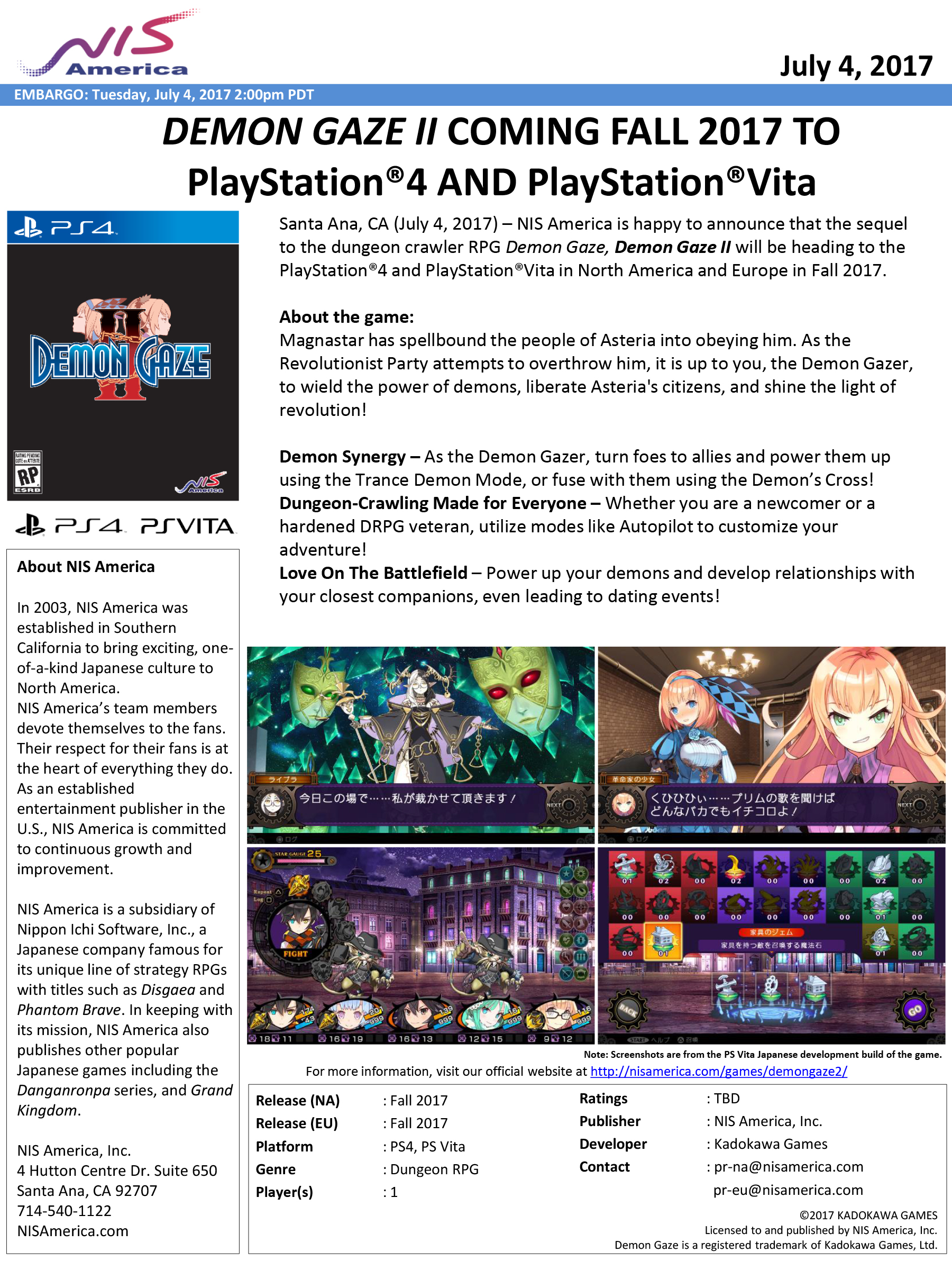 NIS America is bringing Demon Gaze II to North America and Europe for PlayStation 4 and PS Vita this fall, the company announced at Anime Expo 2017.