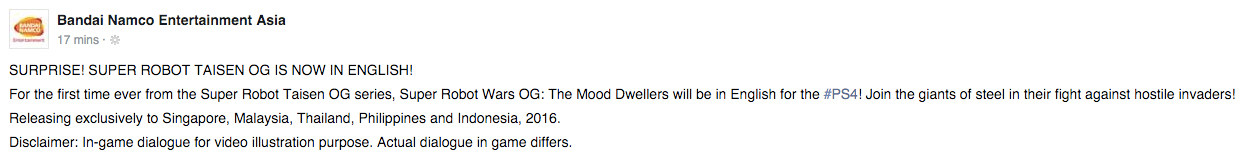 台湾万代南梦宫娱乐于今日宣布,由台湾万代南梦宫娱乐中文化中心进行繁体中文化开发的 PlayStation 4 专用软件《超级机器人大战 OG The Moon Dwellers》繁体中文版游戏将在 2016 年 7 月 7 日发售。