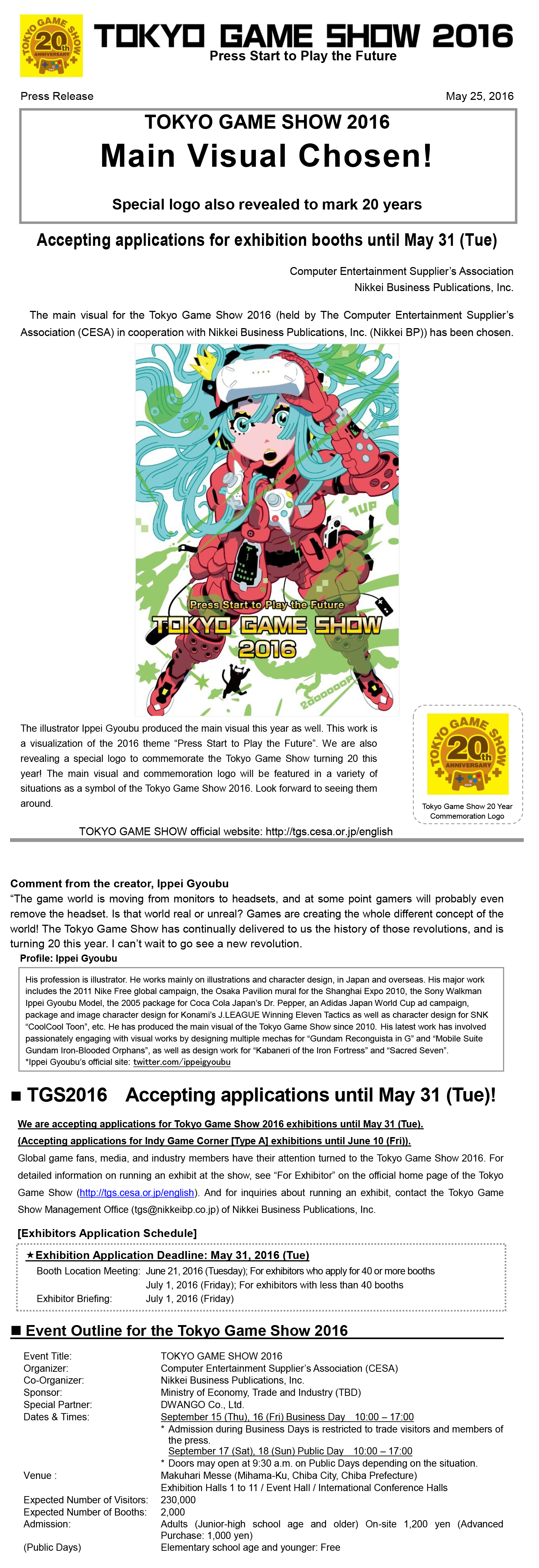 日本计算机娱乐协会(CESA,董事长:冈村 秀树)主办、日经 BP 社(董事长:新实 杰)协办的日本最大规模电玩展活动「2016 东京电玩展(Tokyo Game Show 2016)」,今(25)日公布了活动主要形象与 20 周年纪念标章,主要形象同样由与 TGS 合作多年的插画家形部一平执笔。