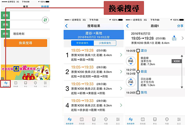 Step 3 選擇路線:按「換乘搜尋」後,會出現多種搭乘方式